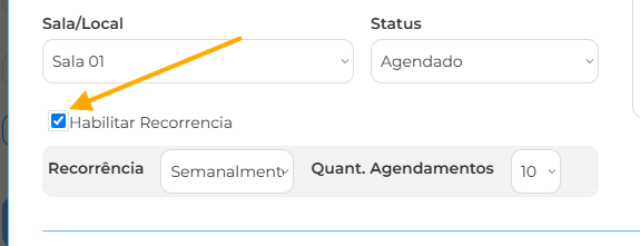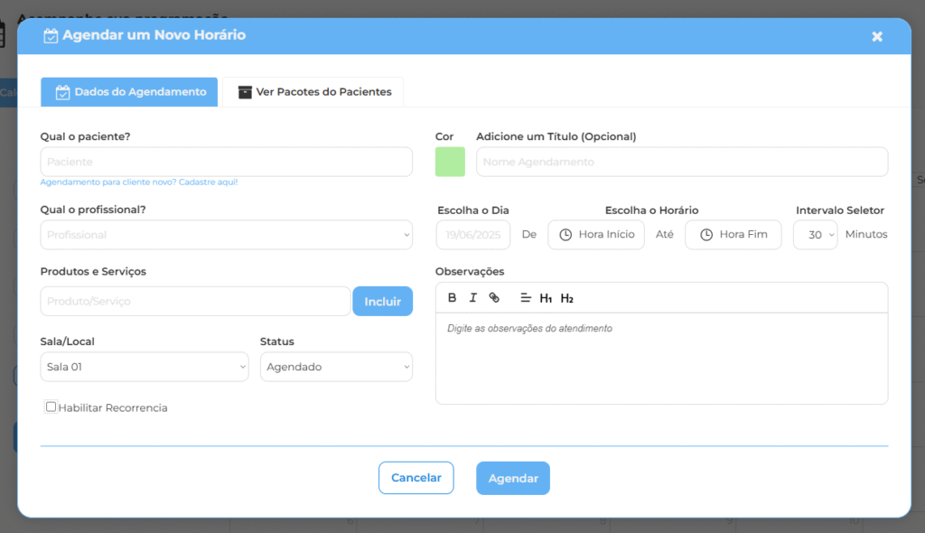 • Recorrência: Você pode escolher, criar vários agendamentos, no mesmo horário. Para um paciente. Basta escolher o intervalo desses agendamentos, no seletor “Recorrência!”