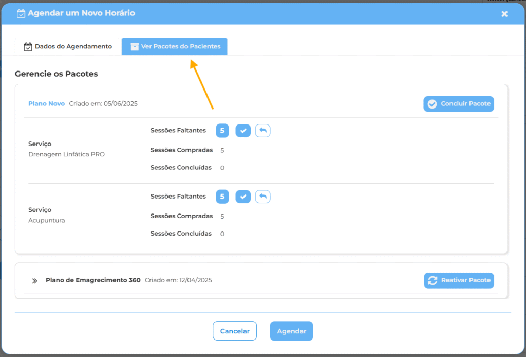 • Consulta de Pacotes: Ao preencher o Paciente, é possível ver os seu pacotes em aberto. basta clicar na aba “Ver Pacotes do Paciente”, no topo da janela.