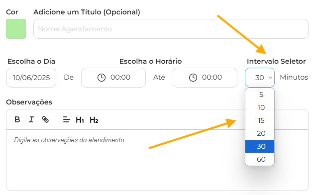 • Como opcional, você pode escolher uma Sala, um Título, Cor (exibida no calendário) e Observações, para esse Agendamento.