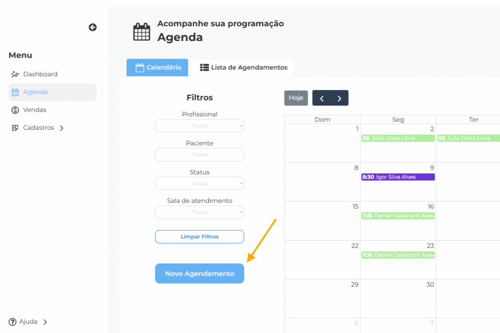 • Clique no botão “Novo Agendamento”, ou clique em uma data no calendário.